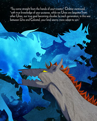 A Celestial Story is my little lovechild and combines two things I’m passionate about: art and storytelling. It’s pretty much a storybook on steroids, with a more mature (and far more epic) storyline. I’ve tried many times to make more traditional comics, with boxes and speech bubbles, but they always get too tedious and eventually become flat (I’m bad at keeping the energy up, I suppose). In ACS’s current style, I have the ability to not only make the art more detailed and colorful, but I can also tell the story rather than have to show it. It allows me to get all extravagant on the wording, if I wish.